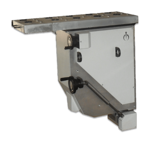 Acompanhador de chapa com funcionamento elétrico comandado através de CNC, possui regulagem de altura e ângulo máximo de trabalho de 60°, excluindo a necessidade de vários operadores para chapas pesadas.